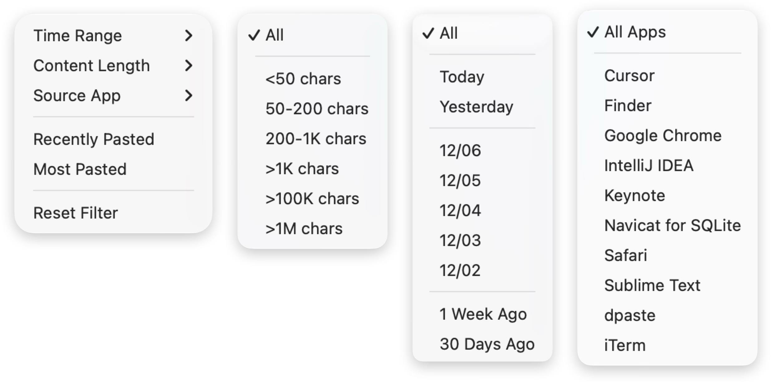 In addition to quick categories, if you need more precise searching, click the filter button in the upper right corner of the clipboard to open more advanced filtering functions, such as filtering by time, content length, source app, recently pasted, most pasted, etc.
