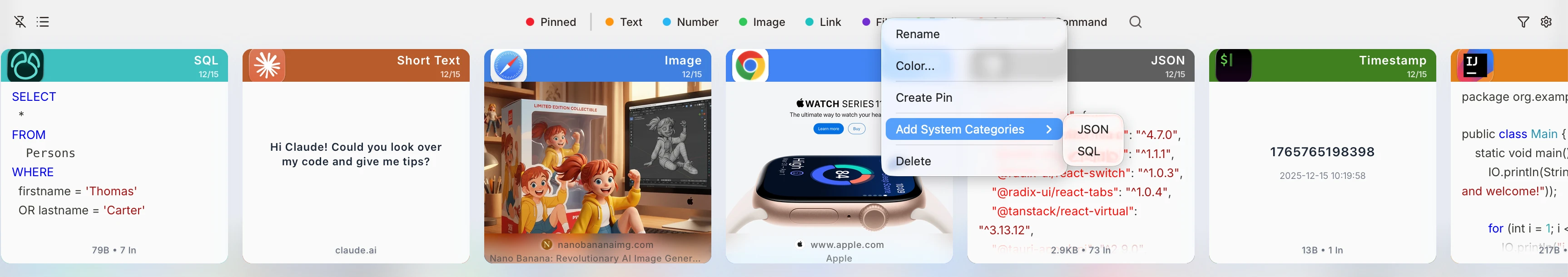 The system presets multiple categories to meet most scenario needs. You can also customize fixed (Pin) categories to manage your frequently used data.