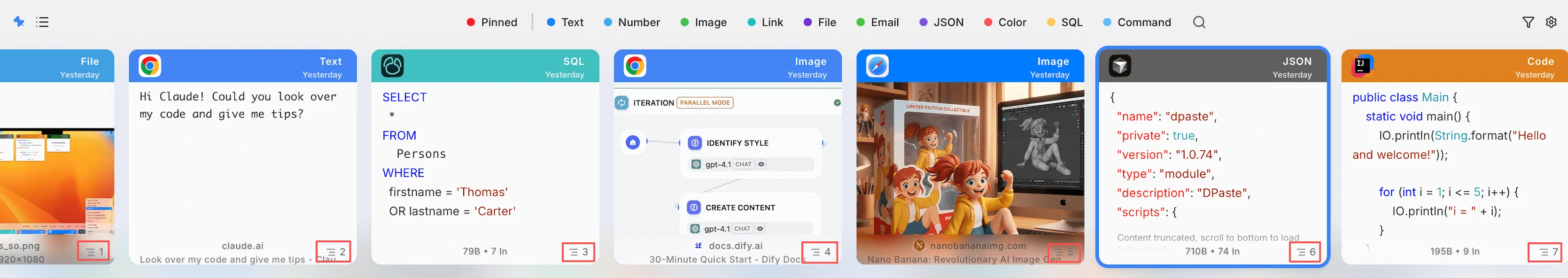 ⌘ + number key to complete pasting. It can quickly paste the target item without adjusting the selection position.⌘ key, number badges will appear in the clipboard card. Press the corresponding number to complete pasting. Pressing ⌘ + Shift at the same time will paste as plain text.
